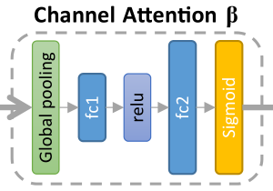 每一个卷积特征通道往往能对应一种特定的直观形象。因此通道的重要性也不同。channel attention可以理解为,为不同的上下文选择语义属性的操作。意义在于,当目标表观不停变换时,深度网络仍能保持一定的适应能力。学习起来也非常简单,如下式:
