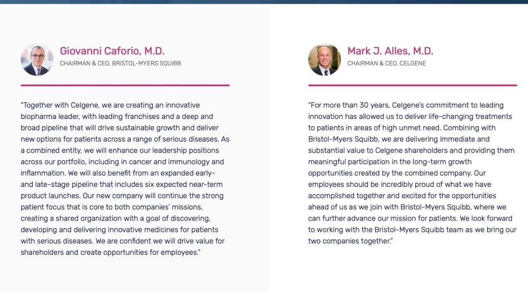 百时美施贵宝董事长兼首席执行官Giovanni Caforio表示,“我们与新基一起,正在打造一个创新的生物制药领军企业,拥有领先的特许经营权和广泛的研发管线,将推动可持续增长,并为各种严重疾病的患者提供新的选择。”
