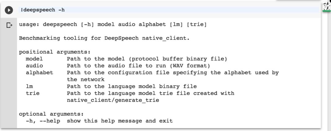 !deepspeech models/output_graph.pb 音频文件名.wav models/alphabet.txt models/lm.binary models/trie