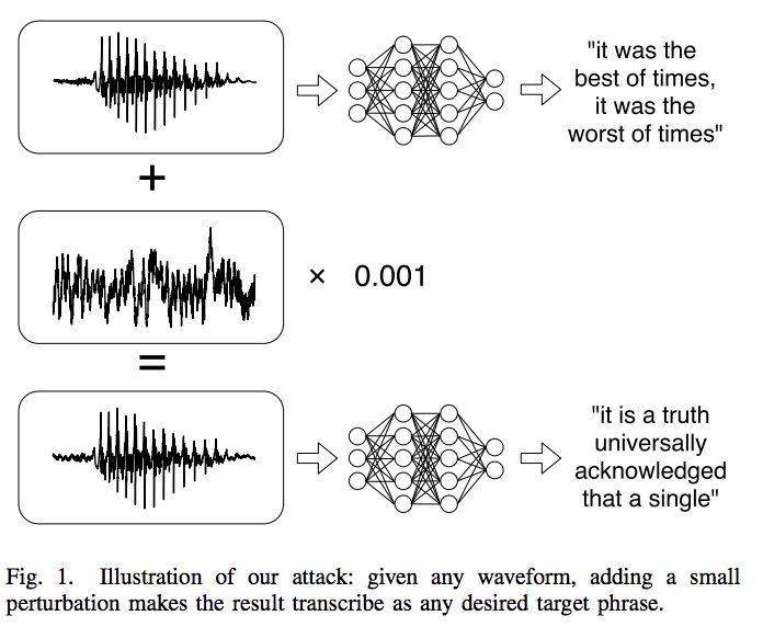 比如,上文中提到的「拳打 ICLR」的博士生之一,UC Berkeley 的 Nicholas Carlini 就与其导师一起,在《Audio Adversarial Examples: Targeted Attacks on Speech-to-Text》一文中给出了对 Mozilla 实现的百度 DeepSpeech 论文的一个白箱、定向、需要直接输入的攻击。给定任意一个波形,甚至不必须是语音,音乐乃至无声都可以,就能用优化的办法生成一个 99.9% 相似的、但是会被语音识别系统转写成完全不同的另一段话的新波形。