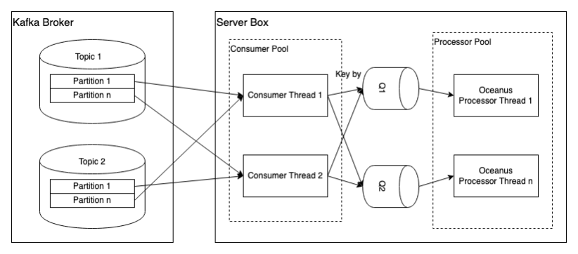 Consumer Pool:负责管理 MQ Consumer Thread 的生命周期,当服务启动时,根据配置拉起一定规模的线程,并在服务关闭时确保每个 Thread 安全退出或者超时停止。整体有效 Thread 的上限与 Topic 的 Partition 的总数有关。
