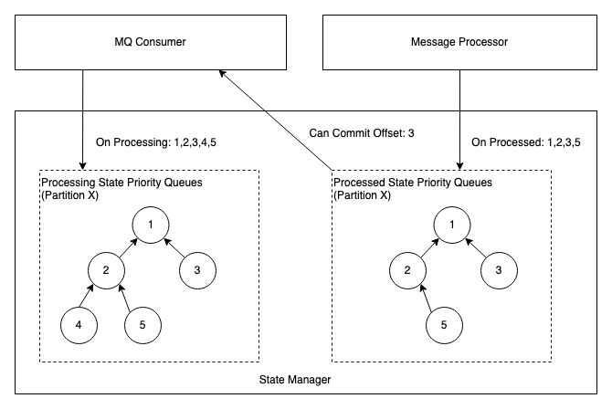 在 State Manager 中,会为每个 Partition 维护一个优先队列(最小堆),队列中的信息是 Offset,两个优先队列的职责如下: