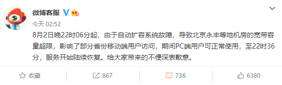 据微博客服消息,8月2日晚22时06分起,由于自动扩容系统故障,导致北京永丰等地机房的宽带容量超限,影响了部分省份移动端用户访问,期间PC端用户可正常使用,至22时36分,服务开始陆续恢复。
