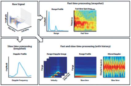与在空间维度上进行目标识别的经典雷达技术不同,Soli提出了基于高时间分辨率的感知机制,通过超高帧速测量人手的反射信号检测微小且复杂的手部动作和手势,进而提取与之相对应的精细信号变化。为了分析手部反射的信号,Soli以一定时间间隔重复发射雷达信号,发射的雷达信号频率从1 kHz逐渐增加至10 kHz;在每一个信号发射周期内,按照相应的采样频率接收反射信号。与雷达信号重复发射的频率相比,人的手部运动相对较慢,可以认为反射信号的特性在单个雷达重复时间间隔内近似为恒定。通过对单个雷达重复间隔内信号的处理,提取瞬时的手部姿势、方向等特征;综合多个连续间隔内提取的瞬时特征,利用其变化情况获得手势的动态运动,例如手部移动的速度等,如图11所示。