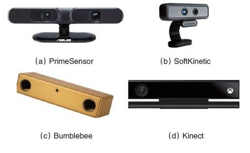 基于深度摄像头的凌空手势识别。基于光学和光波传感器进行深度信息获取和骨骼跟踪,进而实现基于手势识别的体感人机互动,是近年来手势识别领域的研究热点。微软的基于结构光编码及人体骨架实时跟踪技术的Kinect体感装置是这方面的代表性成果,其他还包括PrimeSensor、Xtion PRO、SoftKinetic、Bumblebee等,如图3所示,其特点是能够以相对较好的实时性获取深度图像序列,实现3D数据捕捉、人体识别和骨骼跟踪[15],并可进一步支持复杂手势识别应用的研究。