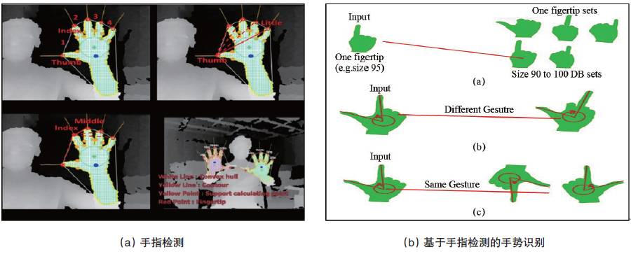 Molina等[21]利用基于Time-of-Flight的深度摄像头,将在距离深度摄像头最近点20 cm以内的像素点作为人手进行分割,实现了一个用于控制窗口应用程序的手势识别系统,此方法对人手的分割虽然摆脱了肤色限制,但是当人手不位于人体最前面时将无法实现对人手的准确分割。文献[22]利用Kinect采集的深度数据进行手指检测,然后将手指检测的结果用于手势识别,如图4所示,但该方法在实际操作中,用户需要将手掌张开并正对深度摄像头才能较好地对指尖进行检测。因此,以上方法均没有完全摆脱人手姿态的限制。文献[23]为了解决上述问题,提出了一种手掌姿态自适应的单指尖动态识别方法,并将该方法应用到了数字0~9和字母a~z等36种凌空手势的识别[24]和脑卒中疾病的检测预警中[25-26],取得了较好的效果。