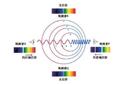 多普勒效应由奥地利物理学家及数学家克里斯琴·约翰·多普勒(Christian Johann Doppler)于1842年提出,是指物体辐射的波长随波源和观测者的相对运动而产生变化。生活中常见此类现象,例如当一辆汽车迎面驶来时,会听到声音越来越高;而当车离去时,声音会越来越低(声音的高低与频率有关)。如图5所示,在运动的波源前面,波被压缩,波长变得较短,频率变得较高,发生蓝移;在运动的波源后面会产生相反的效应,波长变得较长,频率变得较低,发生红移。根据波红(蓝)移的程度,可以计算出波源循着观测方向运动的速度。