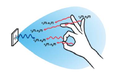 人的手部由手掌、手指等多个运动单元组成,因此Soli接收手部反射的雷达信号是多个离散的、动态散射中心反射信号的叠加。电磁雷达信号的反射参数不仅依赖于信号频率,并且随着手部纹理的变化而改变,通过对信号反射参数的描述,能够实现对手部的形态估计和运动跟踪,如图10所示,其中和为电磁雷达信号的反射参数。