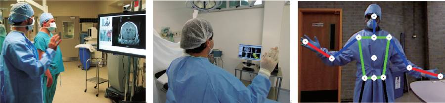 医生在手术过程中,由于无菌的严格环境要求,外科医生在术中进行病人资料查阅时难以通过鼠标、键盘、触摸屏等直接操控电脑,而凌空手势识别技术能够帮助医生无需接触即可进行操控,能够极大提高手术效率。例如,协助外科医生浏览MRT图像的Gestix系统等[35]- [37](图16),都是该方面比较成熟的产品,已应用于实际的医疗环境中。