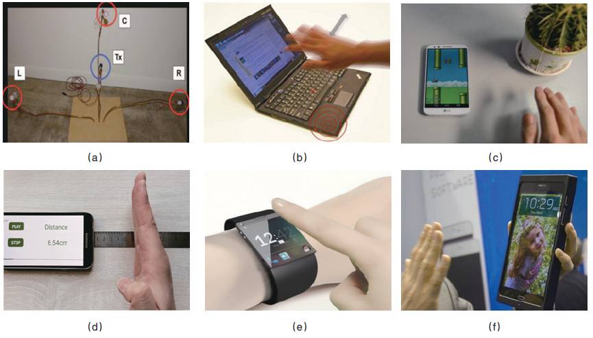 在PC 平台上,微软研究院Gupta 等[28]设计的Soundwave系统,如图8(b)所示,利用设备内置的传感器发射和采集18kHz声波信号,通过信号的频域特征判断手势的方向和速度等属性,实现了对向前、向后、剪刀手等凌空手势的有效识别;Pittman等[29]在Soundwave系统的基础上提出了Multiwave系统,使用双声道扬声器分别发射不同频率的超声波,将麦克风采集到的频率偏移转换到欧式空间,从而生成手势的运动路径、表征相应的动态手势,实现了二维空间的凌空手势识别。