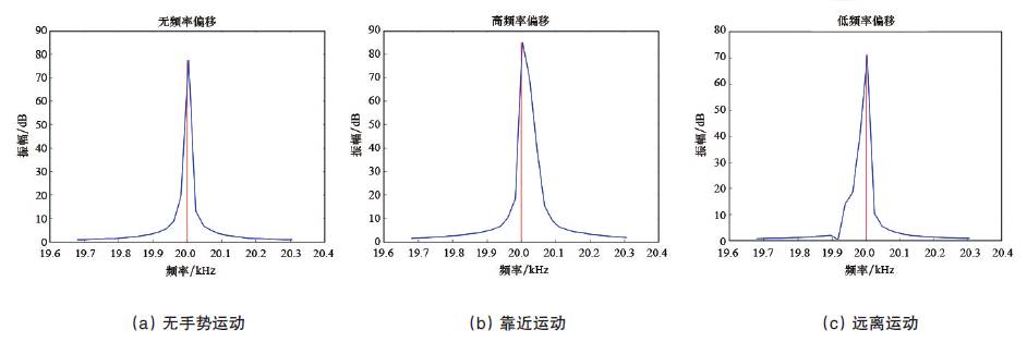当扬声器持续发射超声波信号时,用户进行手势运动将反射超声波;对超声波接收设备麦克风而言,人的手部将被视为声源,手部运动产生的多普勒效应将反映在接收到的超声波信号中。通过对接收的超声波信号进行时频分析,即可判断手势移动的方向和速度。如图6所示,当手势相对于麦克风运动时,将引起信号频率的含量发生变化。