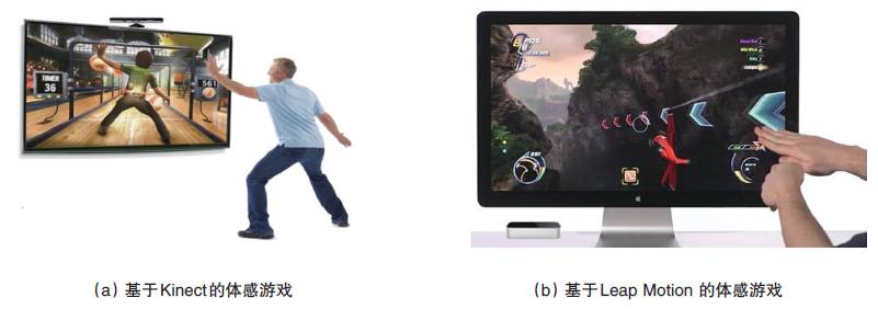 凌空手势识别技术的进步加速了体感游戏的发展。体感游戏是通过肢体动作变化和肢体感受进行操控的一类新型电子游戏,不仅能运动健身、有益于身心健康,而且能够让玩家“全身”投入到游戏当中,享受体感互动的新体验。Leap Motion、Microsoft Kinect 等体感设备的出现开启了体感游戏的新篇章(图21)。带有体感设备Kinect的Xbox 360游戏机是微软于2009年推出的一款体感游戏机,截至2012年9月,Xbox 360全球累积销售量达到7000万部,《生化奇兵》、《荒野大镖客:救赎》、《水果忍者》等都是经典的Xbox 360 游戏;《Boom Ball》、《Dropchord》、《Block54》是依靠Leap Motion进行操控的体感游戏,在为用户带来娱乐体验的同时,也展现了Leap Motion独特的凌空手势操控体验。