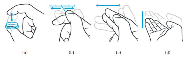 Soli识别凌空手势的关键是通过提取信号特征对手部运动的动作、范围和速度等属性进行表征,因此Soli擅长识别动态手势(action gesture)、而非静态手势(sign gesture)。为此,Soli提出了“虚拟工具(virtual tools)”的概念,通过手指运动模拟按钮、滑块等工具的使用过程,如图12(a)“虚拟按钮(virtual button)”、图12(b)“虚拟滑块(virtual slider)”所示。另外,对一些传统的动态凌空手势,如图12(c)、(d)所示,Soli同样能够表现出良好的性能。