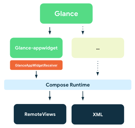 这意味着 Glance 需要启用 Compose,且依赖于运行时 (Runtime)、图形 (Graphics) 和单元界面 Compose 层,但它与其他现有的 Jetpack Compose 界面元素之间不具备直接互操作性。但是,您可以分享应用中的状态或任何其他逻辑,以此来打造一目了然的界面。