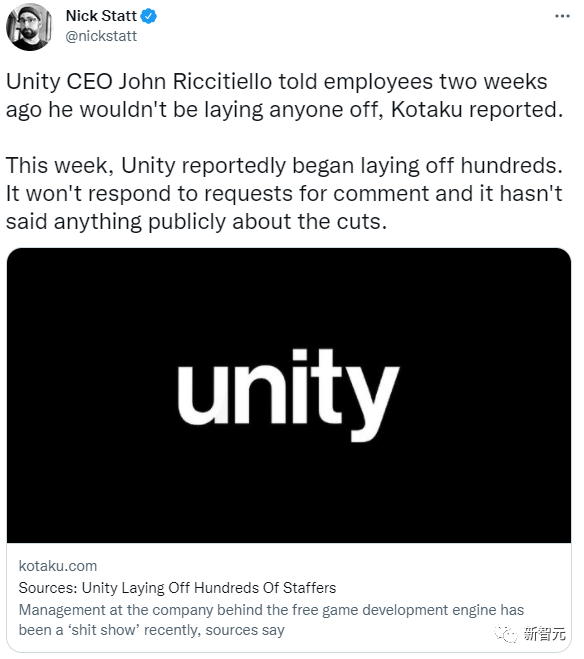 有趣的是,据参加会议的消息人士透露,两周前在大约 3000 名 Unity 全职员工面前,Riccitiello 向员工保证公司没有任何财务问题,而且 「Unity 不会解雇任何人」。