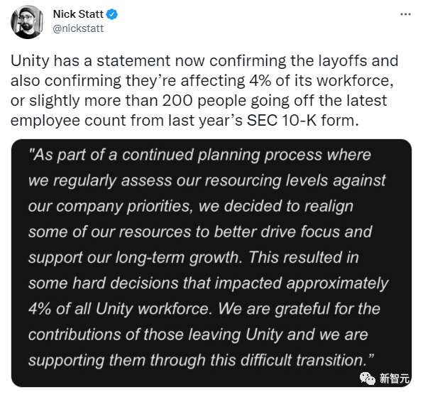 而在六月30日上午,Unity又发公告证实了裁员的消息,裁员比例约为总员工的4%。