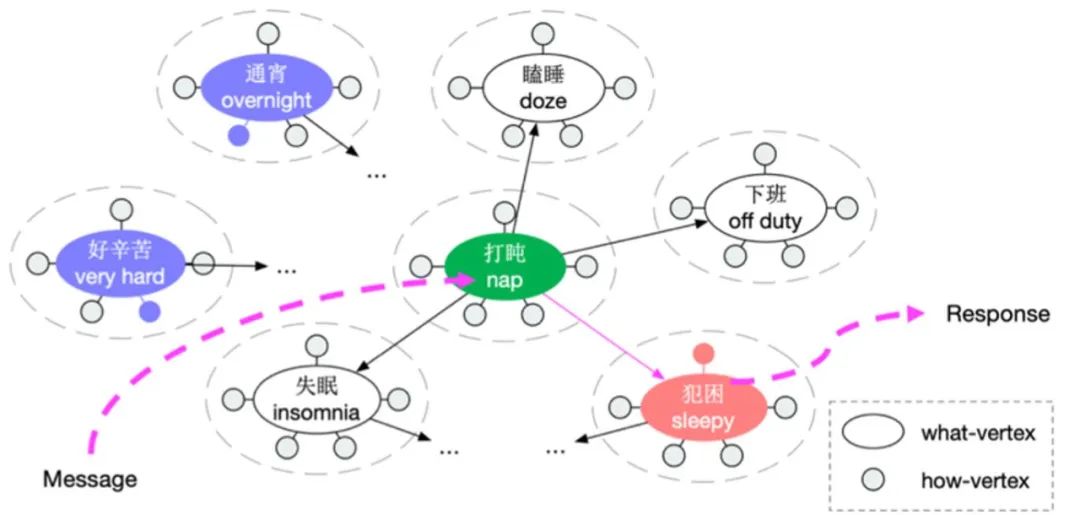 图1是本文方法的框架图,实线椭圆代表“What”节点,实线圆形代表“How”节点。对于当前句(图中Message),策略模型首先将其定位到图中的“What”节点(图中绿色关键词),进而主动规划要聊的内容(图中橙红色的两个节点),再经由生成模型产出回复句(图中Response)。