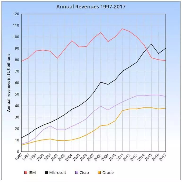 首先,IBM 已经有一段时间表现不佳了:去年的年收入是 1997 年以来的最低水平,是在郭士纳的转型过程中;当然,正如 ZDNet 的这篇文章所指出的,1997 年的 790 亿美元就是今天的 1200 亿美元。