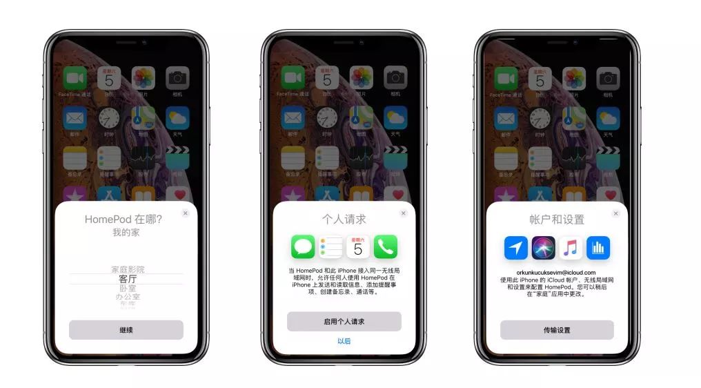 既然是智能音响,第二步就需要进行相关连接和设置。对于超怕麻烦的人来说,简洁快速的设置和连接步骤比较加分,在 HomePod 开机后,将 iOS 设备靠近它,就会主动弹出提醒。比如在我的iPhone上,可以根据提示来:
