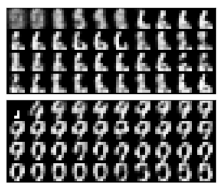 模型完成训练后,我们可以用近似q来初始化一个MCMC采样链。 由于q是p的粗略近似,因此产生的链应该混合得更快。为了证实这个想法,我们在随机初始化的吉布斯(Gibbs)抽样链(顶部)以及从q(底部)样本初始化的链中绘制相邻图形样本。后一种方法在几个步骤中看起来的数字似乎是可信的,而前者产生样本是比较模糊的。