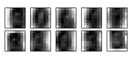 我们训练了限玻尔兹曼机(RBM)模型,对q的每一步执行两个梯度步骤。上图显示了混合伯努利q的每个组分的平均分布; 人们可以在其中区分各种数字的形状。这证实q确实接近于p。