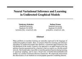 机器学习中的许多问题可以自然地用无向图模型的语言表达。在这里,我们提出了无向模型的黑箱学习和推理算法,优化了模型的对数似然的变分近似。我们的方法的核心是我们表示为灵活神经网络的函数q参数化配分函数的上限。它在学习过程中使得配分函数成为可能,加速采样,并通过统一的变分推理框架来训练各种混合有向/无向模型。我们经验性地证明了我们的方法在几个流行的生成建模数据集上的有效性。