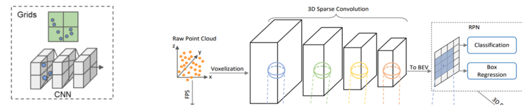voxel-based的先驱的两篇文章voxelnet和second的主要贡献分别是第一个提出采用voxel作为网络输入的方法和引入稀疏卷积替代3D卷积。这里补充一点voxel-based方法的backbone,目前几乎所有的voxel-based方法都采用如下的encoder的backone作为特征提取器。下图左图表示的是点的voxel表示,经过Voxelization化后,经过逐步下采样的encoder过程降为二维 feature map,最后再根据二维的feature的每一个像素点作为anchor point提出候选框。