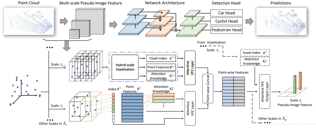 同样采用该思想的还有今年的CVPR20的文章HVNet,如下图所示,也是对场景中点云采用multi-scale的体素划分,最后也会形成一个FPN的结构,但是不同的细节和实现之处还是有很多的,HVNet采用了多线程同时并行处理每一个scale的体素划分,同时对于voxel的特征提取和Voxel-FPN也是不一样的。