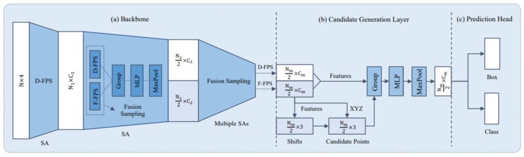 除了CVPR会议,在IROS和ICRA机器人相关的会议上也有很多这方面的研究,其中有一篇在F-pointnet上做出更细致的优化的文章F-ConvNet也是很优秀的工作,有兴趣的同学可以去了解下;这里直接介绍今年CVPR20上的基于Pointrepresentation的文章 3D-SSD,如下图所示,平平无奇的一阶段encoder过程,也就是把pointnet++的decoder部分给去除掉(这样做的目的是减少网络前馈时间,在KITTI上达到35FPS),本文的最主要的贡献点在于将Pointnet++的采样方法由欧式空间度量改为特征空间度量和欧式空间度量相结合的方法,同样的也采用了anchor-free的设计方法,使得显存占用更少。