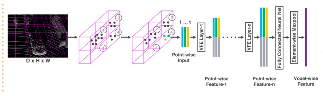 Voxelization对参数的要求比较高,就发展历史来说,VoxelNet(CVPR18)是第一篇采用voxel-representation作为点云输入的网络结构,该文章中max_points_number设置的为35,voxel大小设置为0.5;采用的voxel特征提取方式为增加一个pointnet对每个voxel中的35个点特征提取得到相应的voxel特征(如下图中的featurelearning network所示的内容),但是该参数很明显是会丢失比较多的几何结构信息,但是以这样的参数划分在当时还受到VoxelNet网络后续的3D卷积的显存占用的影响(3D卷积很占显存,因此网络预处理的参数受到影响)。