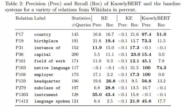表1概述了KnowlyBERT和两个基线系统的精度和召回率。最后一行中描述了的总精度和召回率值,KnowlyBERT的平均精度达到47.5%,比其他两种方法的精度高出30%以上。与关系提取基准(RE)相比,该方法极大地提高了精度,但是与RE基准的17.6%相比,方法的召回率略低,为10.1%。在表2中给出了各种关系比较的实验结果。