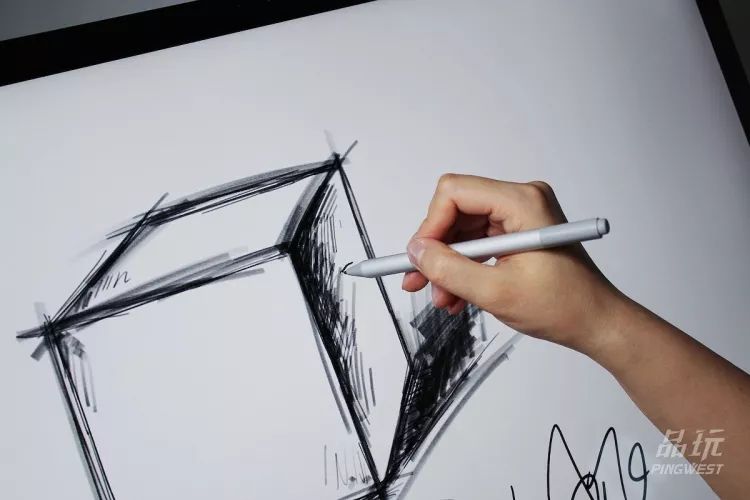 我们没有去测试这台产品的性能,大体上i7-7820HQ加GTX 1070已经可以应付大部分的使用场景。而从一个“画板”的角度来看,只要有一块富有冲击力的画板和一杆超高压感级的画笔就够了。Surface Studio 2的屏幕可能是消费级PC上采用的最顶级的屏幕之一,点亮的一瞬间非常有冲击力:作为“画板”最重要的零部件,Surface Studio 2在第一代的基础上继续升级了这块屏幕。据微软提到,这次Surface Studio 2屏幕亮度超过了500尼特,相比上代提升了38%;同时这块屏幕覆盖了DCI-P3色域,对比度相较于上代提升了22%。经过PingWest品玩(公众号:wepingwest)的体验,这块3:2的屏幕文字阅读、PDF浏览以及网页浏览体验都非常让人惊叹,但看电影可能就留有黑边。几天体验下来,我们发现这块屏幕对第三方应用的适配并不是特别完美,窗口尺寸的问题可以随意调节,但有些弹窗的比例不对就不太完美,比如《英雄联盟》比赛结束后WeGame的弹窗其实是小到看不见字的(还不能调节,差评)。Surface Studio 2的这块屏幕支持十点触控及4096级压感的手写笔操作,微软在套装内附送了一杆Surface触控笔,支持正画、侧画,通过不同压感能实现不同笔触,在实际体验中,无论是写字、标注还是简单的素描,Surface Studio 2都能精准的提供笔触,拥有极低延迟。拿起来笔来就想画画:家属看见画板就要露两手: