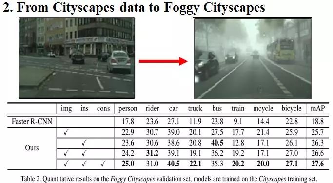 从上图可以发现,左图是Cityscape数据集,右图是Foggy Cityscape数据集,通过本文的域适配,检测器在不同类的目标上都有显著提升。