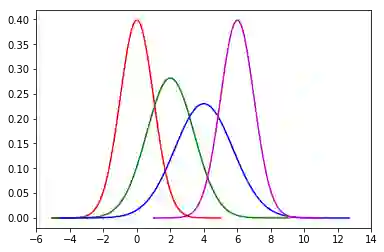 令均值μ=[0,2,4,6],方差σ2=[1,2,3,1],则4个高斯分布的概率密度函数的图形如下。