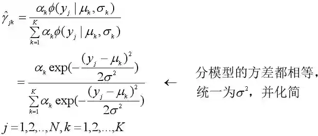 在高斯混合模型中,γj是一个K维的向量,也就是第j个样本属于K个类的概率。假设分模型的方差σk2都相等,且是一个常数,不需要再估计,那么在EM算法的E步我们计算γjk