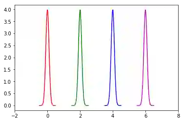 然后令均值μ不变,方差σ2=[0.01, 0.01, 0.01, 0.01],也就是4个分模型的方差σk2相等,而且σk2→0,那么4个高斯分布的图形如下。