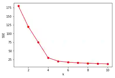 而当类别数到达真实类别数的临界点后,SSE开始缓慢下降,也就是说SSE和K的关系曲线一个肘部形状,这个肘部所对应的K值可以认为是合适的类别数。