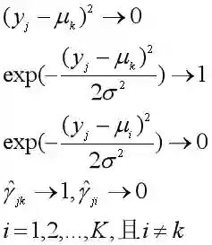 考虑σ2→0时的极限情况,如果样本yj属于第k类的概率最大,那么该样本与第k类的中心点的距离非常近,(yj - μk)2将会趋于0,于是有: