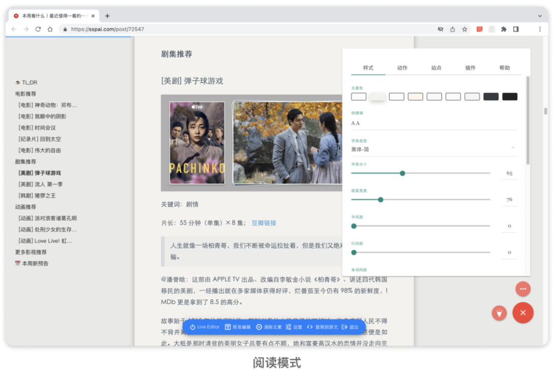 简悦的功能非常丰富,可以满足我们对于网页文章的诸多需求。打个比方,如果你只想让阅读文章的体验变得更加优雅美观,那么简悦的「阅读模式」和各类插件绝对可以让你打造属于自己的「阅读室」。