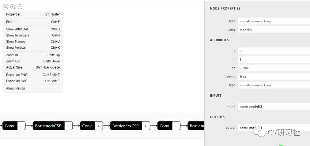 图中可以看到中间区域是网络结构的描述,左侧是菜单栏,可选择显示节点属性、名称等功能,右侧是选中的节点特性,包括类型、名称、输入、输出等。