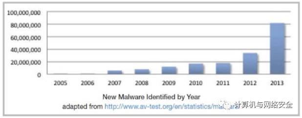 恶意代码的辨识率近几年也在增长,如下图所示。它同时也表现了从2011年开始被辨识出的恶意代码的数量的戏剧性增长。