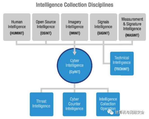 网络情报(CYINT)- 不是核心情报原则里的一种,但是一个相对新颖且在不断发展的领域,它是一个混合体,而且可以包含任何组合或所有上述五个原则。尽管它可以被用来作为网络安全的关键组件,网络情报操作却与网络安全任务独立,而且可以支持涵盖政府和工业的各个方面的大量操作。