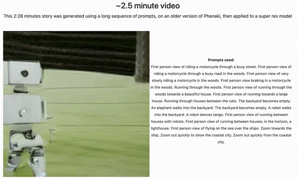 另一位选手Phenaki,则能根据200个词左右的提示语生成2分钟以上的长镜头,讲述一个完整的故事。
