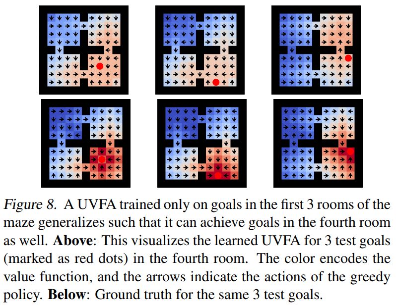 这也解释了为什么纯强化学习方法目前仍是主流,针对元学习和零次学习的研究不太受关注。有一部分原因可能是因为强化学习的基础概念并未经受过多质疑,元学习和零次学习的概念也并没有大规模应用到基础原理的实现中。在所有运用了强化学习的代替方法的研究中,也许最符合我们希望的就是DeepMind于2015年提出的Universal Value Function Approximators,其中Richard Sutton提出了“通用价值函数(general value function)”。这篇论文的摘要是这样写的: