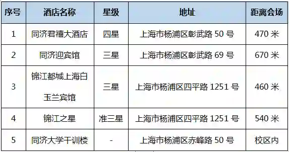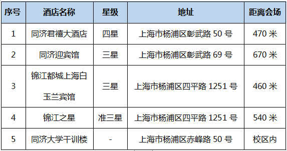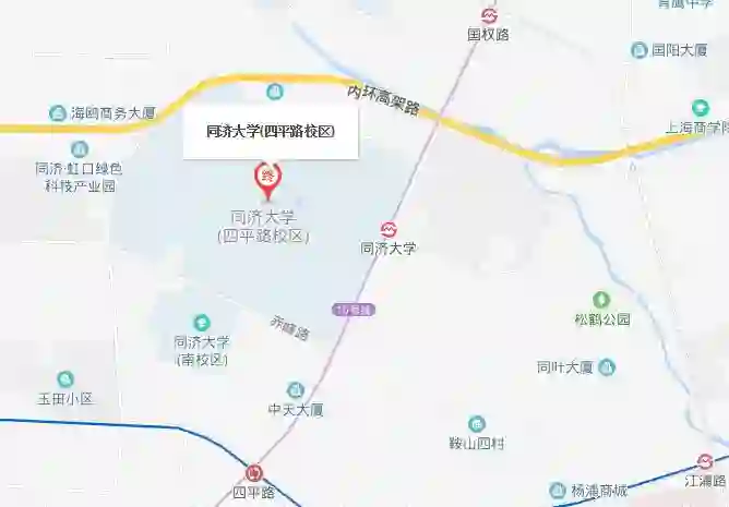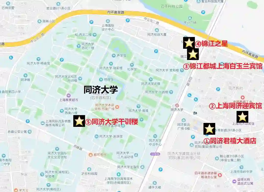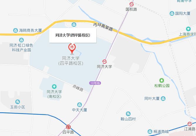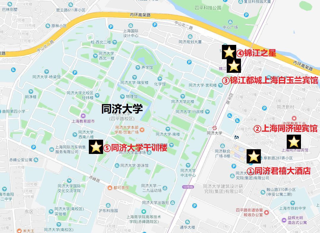 同济大学四平路校区临近五角场商圈。五角场商圈拥有上海蓝天宾馆、如家精选酒店上海五角场店、全季酒店上海五角场万达广场店等多家宾馆。从该商圈乘地铁10号线(虹桥火车站方向)经6站到同济大学站5号口出,步行140米到达,共计约15分钟。