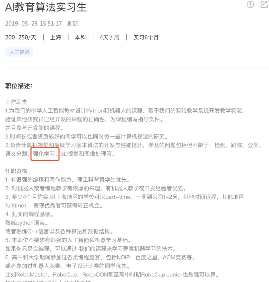 以上是部分企业的强化学习实习岗位,列举并不完整,可以微信投稿私发,以便为大家提供更多的资讯。