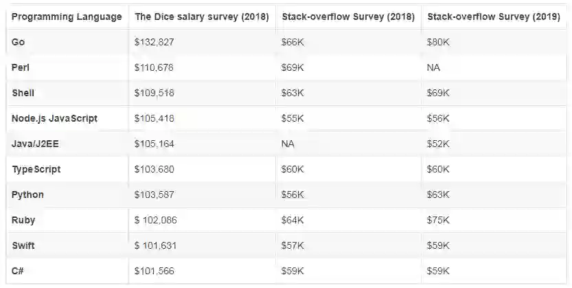 从上表可以看出,Go 开发是市场上薪酬非常高的工作,在 2019 年的 Stackoverflow 调查和 2018 年 Dice 薪资调查中,它都在高薪工作中排名第一。原因其实很简单,因为 Go 是 Google 支持的语言,主要用于 Google 内部,另外 Google 希望推广这种语言所以自然会用高薪来吸引开发者。