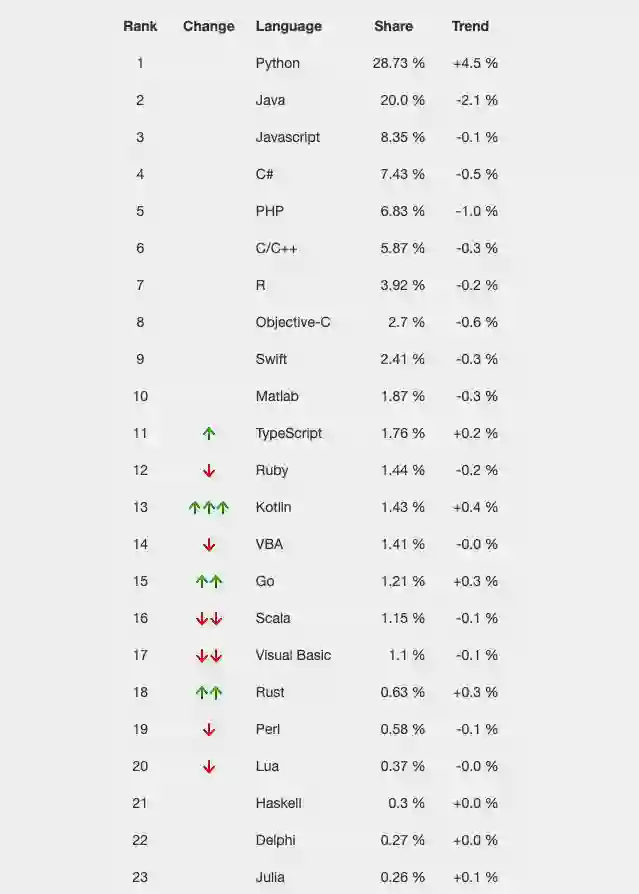 Julia 旨在将 C 的速度和 Python 的简便集成在一起,但奇怪的是,在 Stackoverflow 调查中并没有体现 Julia 的受欢迎程度,但它在数据科学领域颇受欢迎,并且从长远来看它也被视为 R 和 Python 的挑战者。当然,Julia 会继续增长,但对于工作和成长来说,Python 或 R 更好。