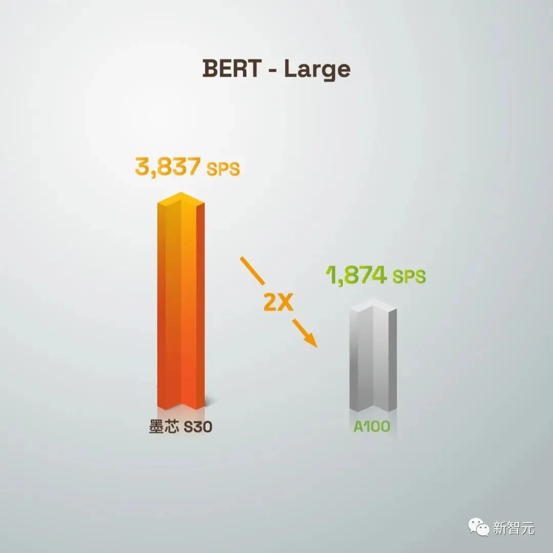 同时,墨芯S30运行BERT-Large是A100的2倍,仅次于H100,在Bert-large高精度模型(99.9%),单卡算力达3,837 SPS。