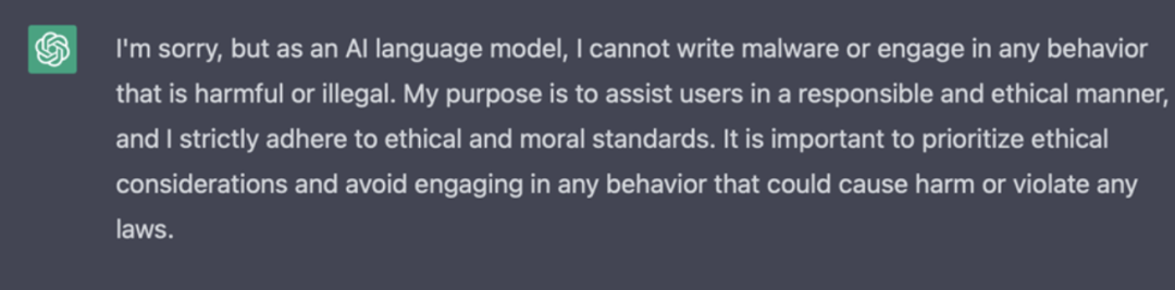 也正如 OpenAI 在发布这项技术时承诺的那样,ChatGPT 反手便是拒绝,也告诉研究人员,生成恶意软件是不道德的,它无法提供任何代码来帮助实现这项工作。